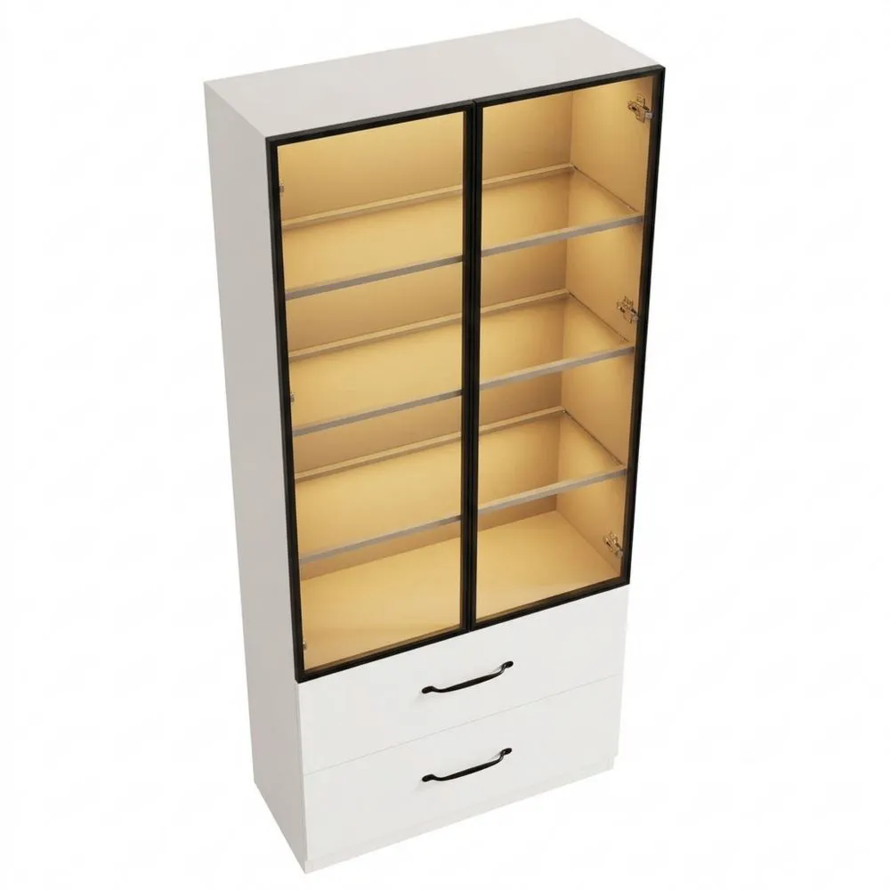 La vitrina cuenta con dos puertas de vidrio templado con iluminación LED en cada nivel, ideal para exhibir bolsos, libros o elementos decorativos.